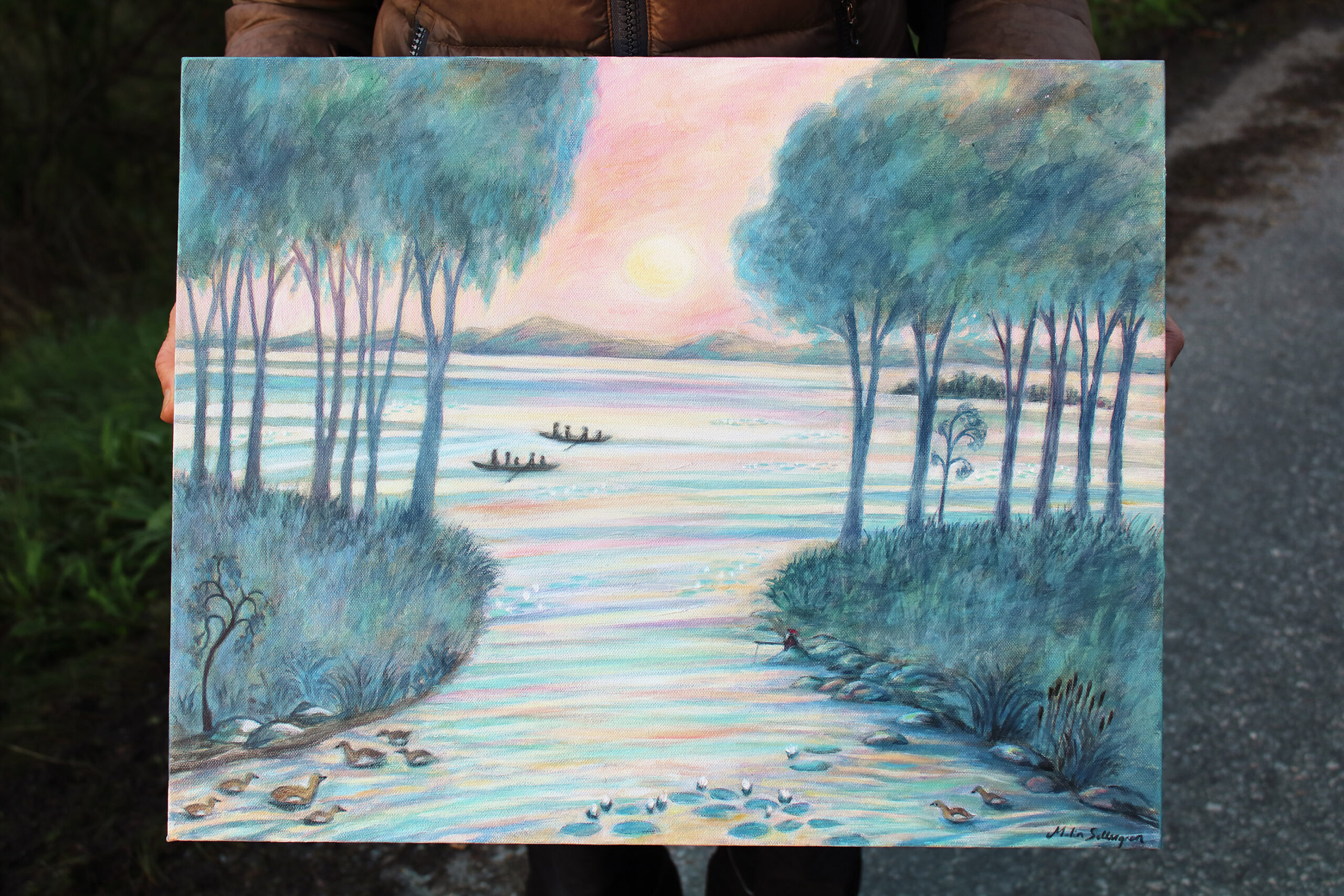 Vad målningen handlar om för mig: Naturen, skärgården, alla krig i världen – som leder till flykt för människor, min pojkväns resa till Kina, min pappas 70-årsdag och familjeutflykter vi har upplevt genom åren, småfåglarnas känsla av att sakna en familj och sedan hitta den, Cloud Monet, impressionismen och mycket mer.