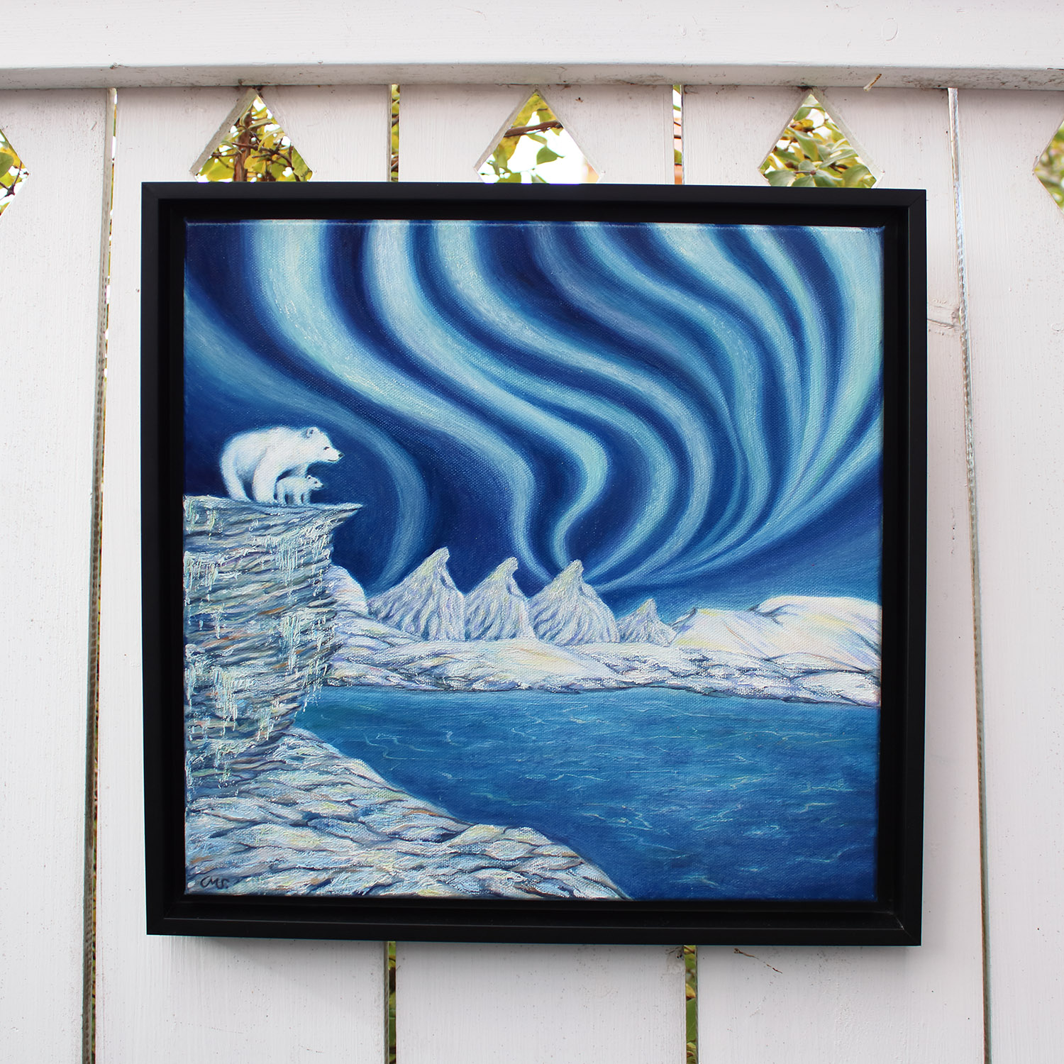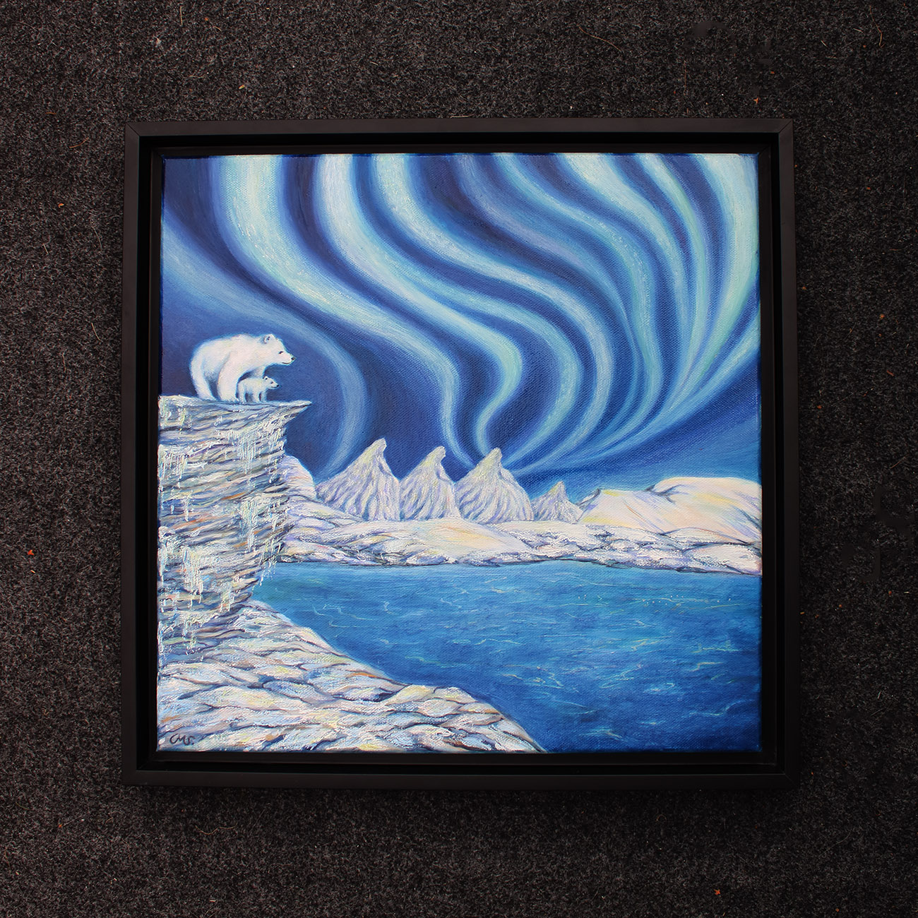 Inspiration till målningen kommer från en fjällresa till Fjätervålen då jag på vägen upp såg norrsken, (även om det varken finns isbjörnar, en frusen sjö eller toppiga berg i just Fjätervålen).
